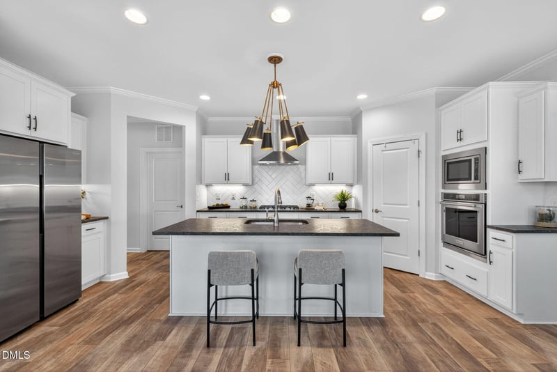Built in 2022, this beautifully maintained 3-bedroom, 3-full-bath semi-detached home in the coveted 55+ community of Corbinton at Kildaire Farm lives like a single-family property. Large windows fill the open-concept living and dining areas with natural light -- and just outside, a grand pecan tree frames the view with the kind of presence no builder can install. The main level delivers everything you need for comfortable daily living. The gourmet kitchen features granite countertops, upgraded white cabinetry, stainless steel appliances, a 5-burner gas cooktop, and a large walk-in pantry that opens naturally into the dining and living space. A dedicated laundry room and screened-in porch complete the main floor.