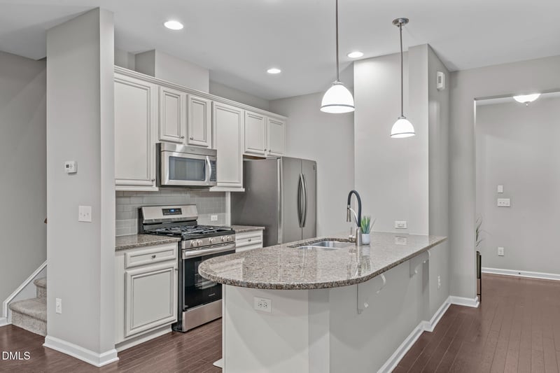 Listing details for 738 Wickham Ridge Rd, Apex, NC 27539 : Welcome to this beautifully maintained end-unit townhome in the desirable Pemberley community, offering 4 bedrooms and 3 full bathrooms with an open layout designed for comfortable living. The main living areas feature wood flooring throughout the first floor, creating a warm and cohesive space for everyday living and entertaining. The family room is filled with natural light and features a gas log fireplace, ceiling fan, and built-in shelving, making it the perfect gathering spot. The open-concept kitchen overlooks the living space and includes a breakfast bar, granite countertops, gas range, and ample cabinet space, making it ideal for both everyday living and entertaining. The first-floor guest suite with a private ensuite bath and walk-in closet provides excellent flexibility and can easily be used as a guest room, home office, or private workspace. Upstairs, the spacious primary suite offers a relaxing retreat with a ceiling fan, walk-in closet, and ensuite bath featuring dual vanities, a soaking tub, and a step-in shower. Two additional bedrooms, each featuring walk-in closets, a full bathroom, and a convenient upstairs laundry room complete the second level. Step outside to enjoy the fenced backyard with a patio and peaceful views of trees, perfect for relaxing or entertaining. Enjoy the added privacy and natural light that come with an end-unit location, along with assigned parking spots for added convenience, along with access to Pemberley's community amenities including a neighborhood pool, cabana and playground. Centrally located between Apex and Holly Springs, this home is just 3.5 miles from downtown Apex and minutes from Holly Springs Towne Center for shopping, dining, entertainment, and movies, with easy access to parks, greenways, US-1 and I-540, for convenient commuting throughout the Triangle.