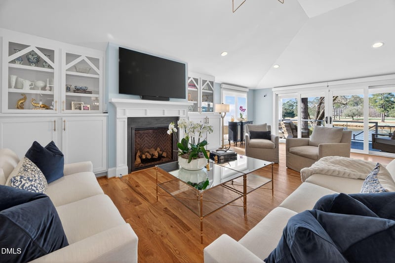 Listing details for 739 Crabtree Crossing, Cary, NC 27513 : Stunning end-unit luxury villa showcasing a sophisticated renovation by Poythress Construction Co., offering refined finishes and timeless design throughout. Sun-filled interiors feature soaring ceilings with wood beams and breathtaking views of Preston Lake and the golf course. The chef's kitchen is a true statement, appointed with custom cabinetry, premium integrated appliances, and an expansive island with oversized quartz countertops—perfect for entertaining. The dining area with a lighted buffet server flows seamlessly into the open-concept family room featuring custom built-ins with glass doors and a gas fireplace. A private office with custom storage and a thoughtfully designed scullery/mudroom with built-in appliances add exceptional functionality. The first-floor primary suite is a serene retreat with a spa-inspired bath and a walk-in closet with professional organization. The upper level offers two private bedrooms and a full bath. Storage is abundant and rarely found in these units, including an unfinished walk-in attic and a garage with custom cabinetry, overhead storage, and epoxy flooring. Outdoor living is elevated on the Trex deck, ideal for sunset views and evening relaxation. A true showpiece blending elegance, comfort, and modern luxury in one of Preston's most desirable communities.
