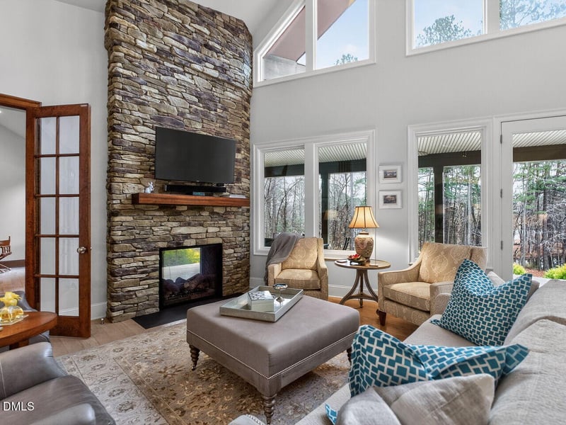 Listing details for 7516 Apex Barbecue Rd, Apex, NC 27502 : A spectacular 3.29 acre property with a custom-built one-level home offering stunning views of a private pond from almost every room. The open floor plan of the main living area features floor-to-ceiling stone fireplace, dramatic 26' beamed cathedral ceiling, exquisite custom hand-blown glass chandelier, gourmet kitchen complemented by a scullery, high end appliances and finishes, custom cabinetry and spacious island, and spacious dining room. Large den off the living area can be used for study, TV, pool table, etc. An elegant master suite is on one side of the house with guest rooms in the other wing. TWO oversized 2-car garages, and just one step into the home from front door or either garage. Sealed crawl space. With city water and sewer, high speed internet, services and shopping, parks and major highways nearby, this home is a special opportunity for the nature enthusiast who wants city services and coveniences with proximity to everything. Horses allowed!!
