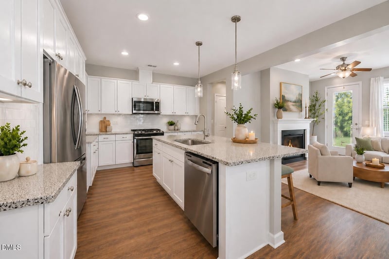 Listing details for 755 Creekway Dr, Fuquay Varina, NC 27526 : Lovingly maintained and thoughtfully upgraded end-unit townhome offering rare privacy and standout features. Enjoy a true two-car garage and a north-facing end unit filled with natural light from multiple exposures, including extra side windows that interior units don't have. Elegant touches include beautiful frosted decorative privacy films on exterior doors and select windows, enhancing style and privacy while still allowing natural light to filter through. The open floorplan centers around a welcoming family room with a fireplace, creating a comfortable flow for everyday living and entertaining. Thoughtfully designed landscaping includes roses, flowering trees, established perennials that return year after year, and evergreen plantings for privacy, all going well beyond builder grade. The end-unit location provides additional green space between buildings, creating a peaceful outdoor setting ideal for gatherings, play, or everyday enjoyment. Inside, upgraded wooden closet shelving adds both function and charm. Many of the hard upgrades are complete -- a move-in ready home that feels truly special. HOA-maintained lawn care and additional parking add to the convenience. Steps from banks, restaurants, medical offices, and schools. Close to RTP, Hwy 55, 540, Route 1, I-40, and a short walk to downtown Fuquay's shops, dining, and breweries. Don't miss this rare opportunity to own in Fuquay-Varina!