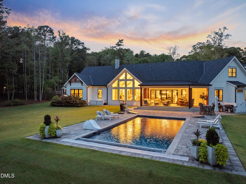 Listing details for 7610 Hazelhurst Cir, Apex, NC 27502 : Welcome to this private gated estate set on over fifteen acres of serene countryside in the heart of Apex. This remarkable property offers a rare blend of peace, privacy, and proximity, where natural beauty meets effortless convenience just minutes from Highway 540. Thoughtfully crafted with timber beams sourced from Idaho and western North Carolina, along with rich cedar accents, the home is filled with warmth and character. Expansive windows flood the interiors with natural light while framing tranquil, wooded views from nearly every room. The main level features three bedrooms, including a stunning vaulted owner's suite complete with a private porch, outdoor shower, and sauna. At the center of the home, a two-story family room anchors the open-concept layout, connecting to a chef's kitchen outfitted with professional-grade Miele appliances, custom cabinetry, a walk-in pantry, and a fully equipped scullery with additional oven and prep space. Designed for both intimate evenings and large gatherings, the home also features an entertaining bar, a built-in coffee station, beverage drawers, and multiple flexible living spaces, including a game room, a private study nook, and a custom bunk room. Outdoor living is equally impressive, featuring a resort-style saltwater pool with sun ledge and automatic cover, expansive covered and Phantom screened porch and thoughtfully designed lounge and dining areas. The property also includes a private pond, fire pit, raised garden beds with watering station, custom chicken coop, and a fully fenced backyard surrounded by mature trees, creating a true connection to the land. Additional highlights include a 40-foot deep garage, smart home automation, Sonos audio system, pre-wired for generator, three HVAC systems, tankless water heater, whole-home water purification, porch piped for outdoor heaters, and a comprehensive security system. Conveniently located 7 minutes to new GRACE campus, 12 minutes to Target, and 4 minutes to I-540. This one-of-a-kind Apex estate offers a lifestyle defined by privacy, craftsmanship, and natural beauty - an extraordinary opportunity to experience refined country living without compromise.