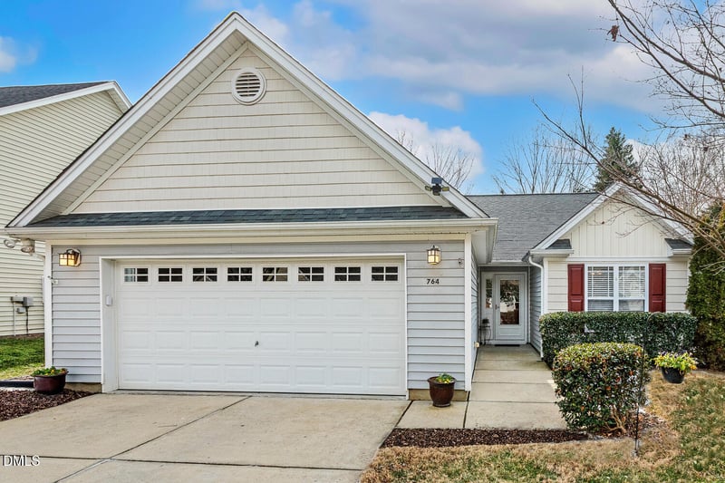 Listing details for 764 Cabin Branch Dr, Fuquay Varina, NC 27526 : Charming ranch-style home ideally located near downtown Fuquay-Varina, offering comfort, convenience, and low-maintenance living with lawn care included in the HOA dues. Inside, the home is filled with natural light and enhanced by cathedral ceilings in the kitchen, dining area, family room, sunroom, and owner's bedroom. The kitchen is well appointed with stainless steel appliances, ample cabinet and counter space, a pantry, and a sunny breakfast area. The family room features a cozy gas fireplace, while the bright sunroom offers direct access to the patio. The owner's suite includes a walk-in closet and a private bath with a double vanity and walk-in shower. Two additional bedrooms, a full bath, and a convenient laundry closet complete the interior. A new water heater installed in January 2026 adds peace of mind to this well-maintained home. This inviting property features an attached garage, covered front porch, and a rear patio, perfect for relaxing or entertaining. Enjoy easy access to downtown shopping and restaurants, nearby parks, and major routes including Hwy 55, Judd Parkway, and The Triangle Expressway.