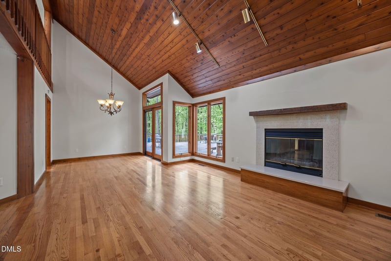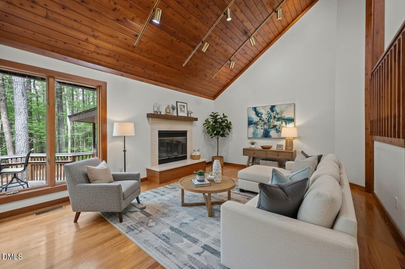 Listing details for 767 Redbud , Pittsboro, NC 27312 : Tucked away on 5.3 acres of peaceful, wooded surroundings, this 3-bedroom, 3.5-bath home offers a private retreat just 5-10 minutes from downtown Pittsboro! A winding setting with a trail leading down to the river creates a rare opportunity to enjoy nature right outside your door. Inside, the living room features soaring vaulted ceilings with exposed wood beams and a cozy fireplace, bringing warmth and character to the heart of the home. The main-level primary suite provides convenience and comfort, while the second floor offers two additional bedrooms and a versatile loft space--ideal for a reading nook, office, or additional lounge area. Step outside to a sprawling deck designed for entertaining, complete with multiple areas to gather, relax, and take in the wooded views. Whether hosting or enjoying a quiet morning, the setting delivers a true sense of escape. The expansive unfinished basement (1,936 sq ft) offers incredible potential, with multiple flex spaces ready to be customized to fit your needs--whether for hobbies, storage, or future expansion. A unique blend of privacy, natural beauty, and proximity to Pittsboro--this property is ready to be enjoyed as-is or taken to the next level!
