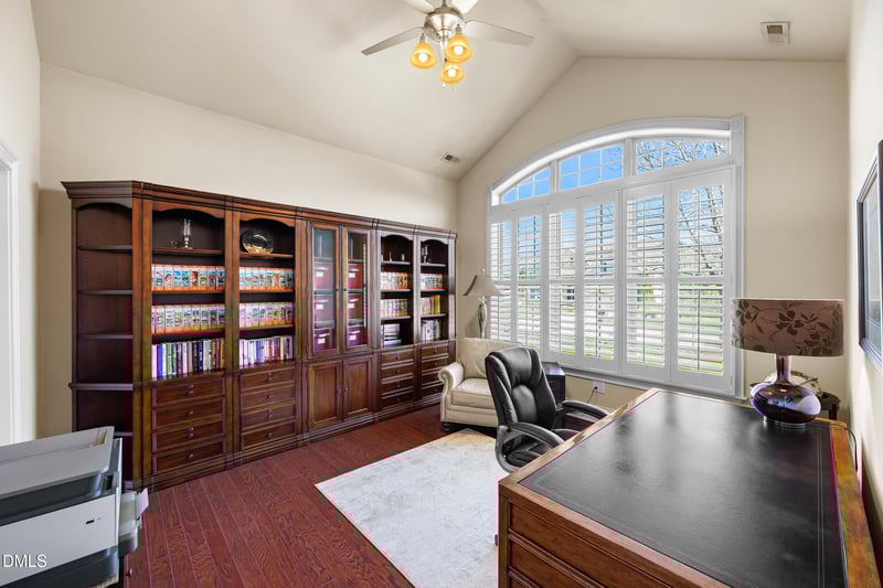 The kitchen is the heart of the home, featuring a massive island with abundant storage and opening to a beautifully customized dining space with built-in cabinetry, wine storage, and a beverage refrigerator is perfect for hosting. Cherry hardwood floors run throughout the main living areas and bedrooms, adding warmth and timeless style.