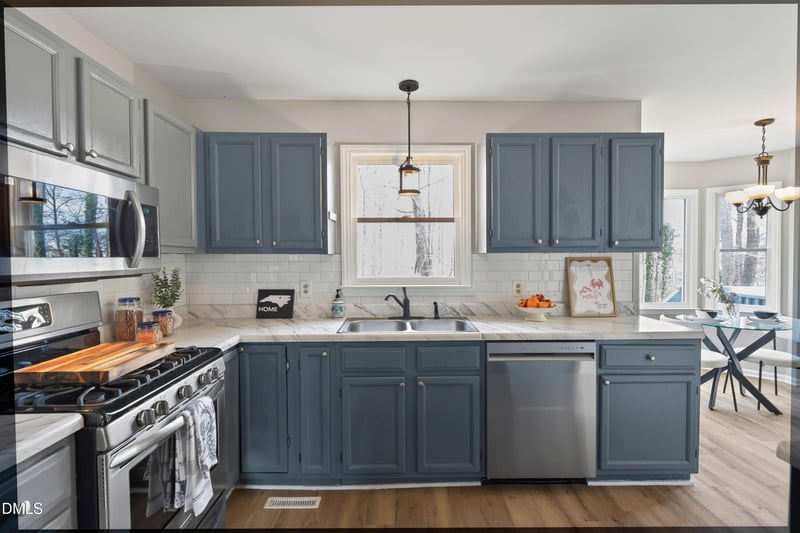 Inside, you'll find new interior paint, a welcoming entry foyer, and a traditional dining room for gatherings. The kitchen includes a generous breakfast area with a bay window, pantry storage, and gas range, flowing easily into the main living space.