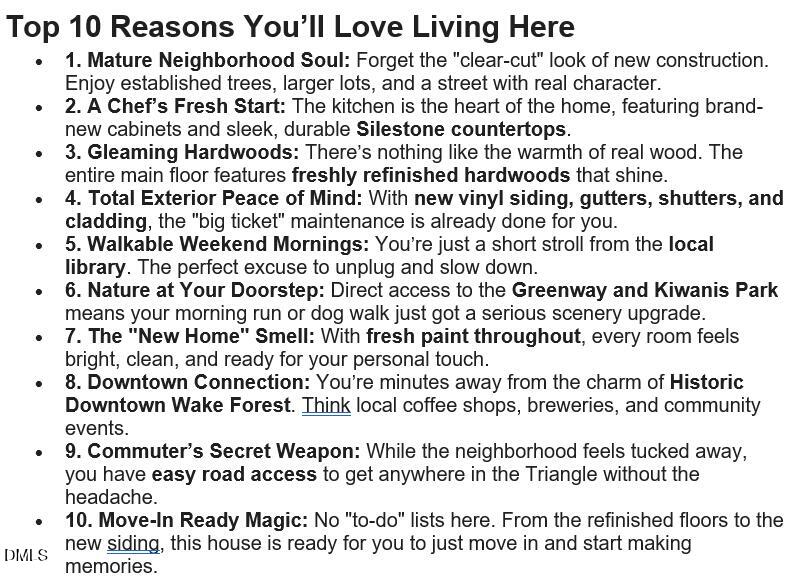 Listing details for 812 Old Magnolia Ln, Wake Forest, NC 27587 : Location, Lifestyle, and Move-In Ready! This is a home for the buyer who values a move-in ready home but refuses to sacrifice the character and walkability of an authentic North Carolina town. This home is walkable to the heart of downtown Wake Forest for Friday Night on White, the Farmer's Market, restaurants and shopping. A short stroll to the Greenway Trails, park, and Library. While you feel the peace and quiet from an established neighborhood, you have quick access to NC 98 and US 1, making your commute effortless. Step inside to find a home that feels new without losing the feel of an established neighborhood with charm and mature trees. The main floor features stunning refinished hardwoods and a fresh, neutral palette. The heart of the home is the kitchen with new cabinets and premium Silestone countertops. Cozy up to the gas fireplace on these cold winter nights. The transformation continues outside with new vinyl siding, gutters, shutters, cladding, and gorgeous Trex deck ensuring long-term durability and peak curb appeal. Come and see for yourself!