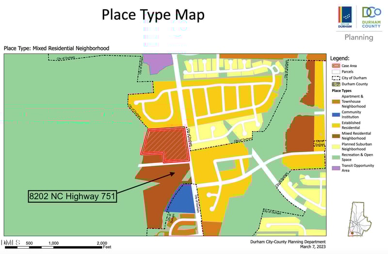 Listing details for 8202 N C Highway 751, Durham, NC 27713 : Large 3.7+ acre property located on Highway 751 just 1/2 mile South of Interstate 40 and The Streets at Southpoint, under 15 minutes to Research Triangle Park, downtown Durham, downtown Chapel Hill and RDU International Airport. Durham's 2023 Comprehensive Plan designates the property for Mixed Residential Neighborhood. This land use type includes apartments, see MLS attachments. Act now to participate in this rapidly growing part of the Research Triangle. Neighboring parcels approved for 29+ dwelling units per acre. Sellers will entertain offers on standard form 580L-T, proof of funds must accompany any offer. Contact listing agent with questions.