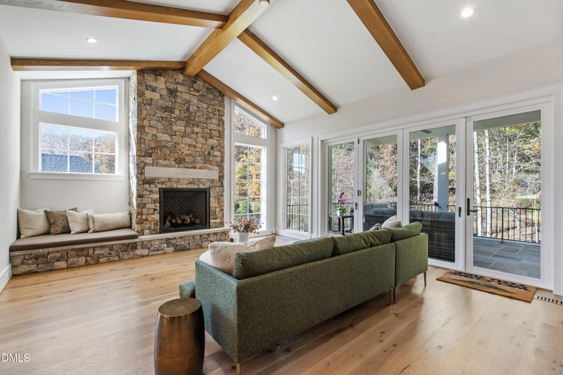 Listing details for 824 Journeys Rest Ln, Apex, NC 27523 : Set on a wooded 0.5-acre homesite in West Cary, this custom 4,661-square-foot residence blends refined design with exceptional everyday livability. A dramatic two-story foyer window fills the home with natural light, while a hand-hammered iron staircase, Raleigh Reclaimed wood accents, designer fixtures, Lutron automated shades, and a floor-to-ceiling locally sourced stone fireplace create a striking and inviting main living space.