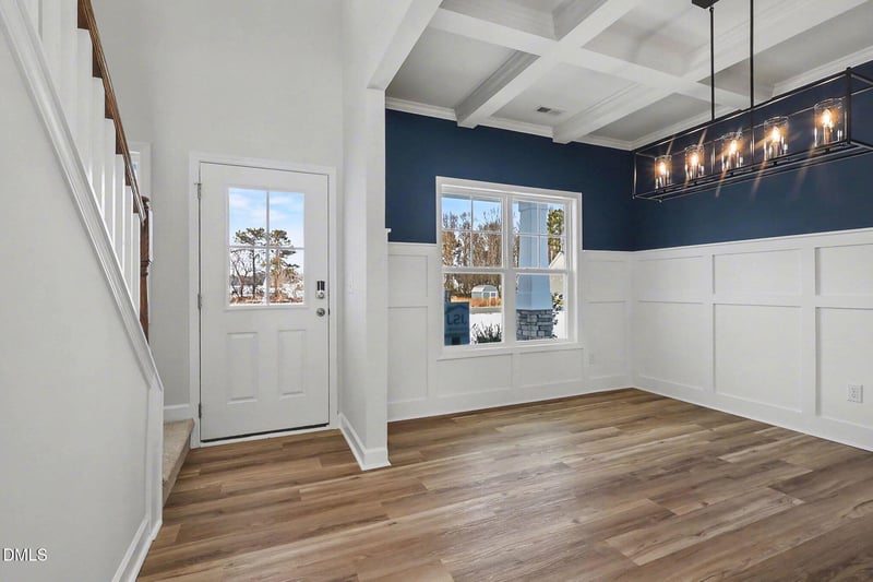 Nearby, the master-planned community of Eastfield Crossing provides even more amenities and conveniences. The main level welcomes you with a formal dining area adorned with a coffered ceiling, wainscotting, and an open living and kitchen space equipped with granite countertops, island, and a spacious living room featuring a cozy gas fireplace. You'll also find a generous first-floor owner's suite complete with an ensuite bathroom, along with a laundry room conveniently located near the garage, plus a half bath and mud room.