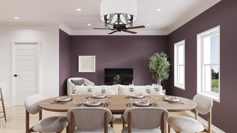 The family room flows effortlessly into the dining area and upgraded kitchen, making the space ideal for both daily living and entertaining. The kitchen is equipped with stainless steel appliances, a center island with pendant lighting, crown-molded cabinetry with stylish hardware, and added front-window blinds for privacy and convenience. A striking brick-pattern backsplash serves as a beautiful focal point and adds character to the space.