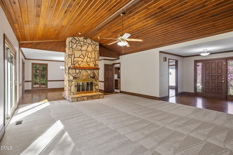 Listing details for 8616 Oneal Rd, Raleigh, NC 27613 : Nestled on a wooded lot in North Raleigh, this spacious home offers a flexible layout, generous living spaces, and beautiful natural surroundings. The main level features hardwood floors, detailed trim work, and large windows that bring in natural light throughout. The family room centers around a striking stone fireplace and opens to the dining area, creating an inviting space for both everyday living and entertaining. The kitchen offers abundant cabinetry, ample counter space, and a central island with cooktop, along with a breakfast area overlooking the backyard. The primary suite on the main floor includes multiple walk-in closets and a spacious bath with double vanity, soaking tub, and separate shower. Two additional bedrooms are located on the main level. Outdoor living is a highlight of the home with a large deck and screened porch overlooking the private yard. The finished lower level provides additional flexible living space including a large bonus/flex room, workshop area, and direct access to the patio and backyard.