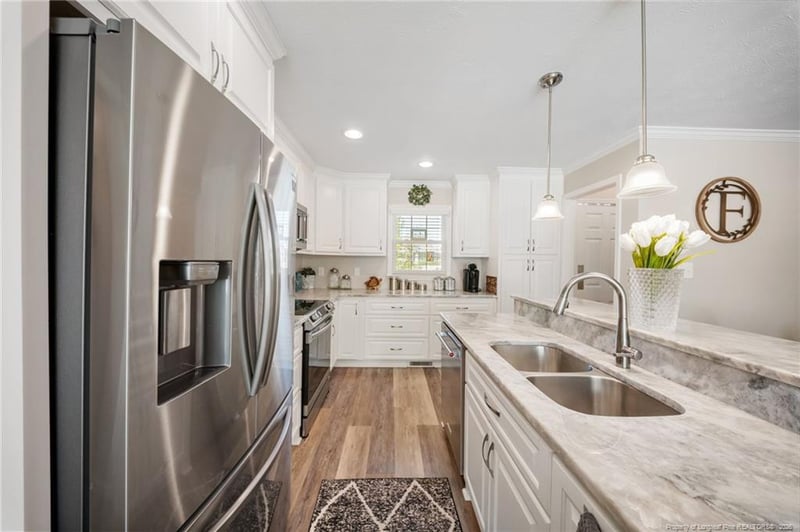 Listing details for 898 Long Iron Dr, Fayetteville, NC 28312 : Welcome to golf course living in the highly sought-after Baywood Golf Community—where timeless design meets modern luxury. This beautifully renovated two-story brick home offers nearly 3,000 sq ft of thoughtfully curated living space, featuring 3 bedrooms, 2.5 bathrooms, formal living, formal dining, a bonus room, and a newly finished heated and cooled flex space. Designed with both everyday living and entertaining in mind, the open-concept kitchen, living, and dining areas create a seamless flow. The chef’s kitchen is a true showpiece, featuring custom cabinetry, marble countertops, stainless steel appliances, and an oversized island perfect for gathering. Natural light pours into the dining area, creating a warm, inviting atmosphere. The main level also offers formal living and dining rooms, adding versatility and elegance, along with a convenient laundry room and half bath. Retreat to the first-floor owner’s suite—a private sanctuary complete with an oversized walk-in closet and a spa-inspired ensuite featuring a freestanding soaking tub, walk-in tile shower complete with a rainhead shower head, and dual vanities. Upstairs, you’ll find spacious secondary bedrooms, a bonus room, and the newly finished flex space—ideal for a guest suite, home office, gym, or additional living area, the possibilities are endless. Additional highlights include LVP flooring throughout the main living areas, primary bedroom, and bonus room, abundant storage, and a two-car garage. Step outside to your covered rear porch or patio and take in the adjacent golf course views—perfect for relaxing or entertaining. Enjoy the unmatched lifestyle of Baywood, with optional golf, pool, tennis, and social memberships, plus the convenience of golf cart-friendly living with easy access to the clubhouse and greens.This is more than a home—it’s a lifestyle.