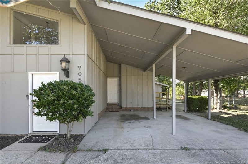Listing details for 905 Bucknell Rd, Fayetteville, NC 28311 : Welcome to this well-maintained 3-bedroom, 2-bath home conveniently located less than 15 minutes from Fort Bragg. The main living area features vaulted ceilings, a wood-burning fireplace, and an open layout with patio doors leading to a large outdoor patio space. A few steps up, the dining area connects to the kitchen with stainless steel appliances, updated finishes, and a laundry area. Sliding glass doors from the kitchen and primary bedroom provide direct access to a second patio, perfect for grilling or relaxing.The home offers two guest bedrooms and a full bath, along with a primary suite featuring a dual-sink vanity and separate shower. Fresh paint throughout most of the home adds a clean, move-in ready feel.Outside, enjoy a large backyard, additional patio space, and a 2-car carport. Conveniently located near shopping, dining, and base access—this one is ready for its next owner.