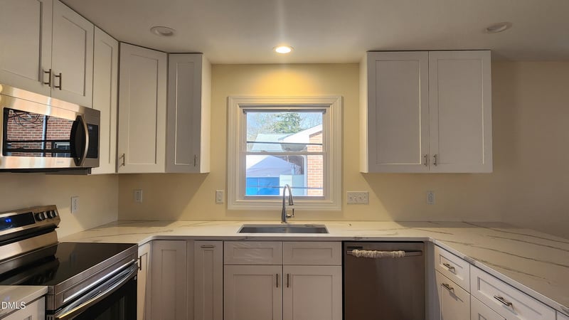 Listing details for 910 Ruby St, Durham, NC 27704 : Beautifully renovated 3-bedroom 2 bath, all brick ranch home on a large lot with a spacious backyard in a well-located Durham location. Conveniently located near I-85 for an easy commute and just minutes from Duke University, downtown Durham, shopping, dining, and entertainment. This home has been taken down to the studs and completely renovated, major upgrades include brand new electrical and plumbing systems, new water heater, all-new HVAC and ductwork, and a new roof. Enjoy beautiful refinished floors throughout and all-new windows that bring in abundant natural light. The updated kitchen shines with new cabinets, quartz countertops, and stainless-steel appliances, plus new insulation throughout for comfort and efficiency. A new concrete driveway and oversized backyard provide excellent space for parking, entertaining, or relaxing. Move in and enjoy worry-free, modern living.