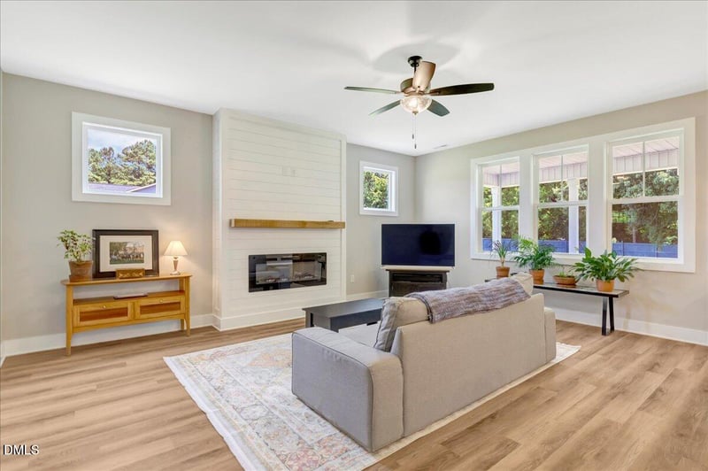 Listing details for 9133 Raccoon Dr, Middlesex, NC 27557 : Big space. Bold style. Zero compromises. On nearly an acre, this 3-bedroom, 2-bath ranch delivers the space, layout, and finishes you've been searching for--all in a like-new, one-level design. Oversized windows flood the home with natural light, luxury vinyl plank flooring runs throughout, and a sleek electric linear fireplace offers a cozy place to unwind at the end of the day. The kitchen is built to impress with custom soft-close cabinetry, quartz countertops, a statement tile backsplash, and stainless steel appliances--including a five-burner range with built-in convection and air fryer. The refrigerator, washer, and dryer all convey, making move-in simple. A separate dining room adds flexibility for everyday living or entertaining. The split-bedroom floorplan offers privacy, with a spacious primary suite featuring a custom closet, dual vanity, and a beautifully tiled walk-in shower. Two additional bedrooms and a full bath are thoughtfully positioned on the opposite side of the home, along with a tucked-away laundry room. Enjoy the outdoors from the welcoming front porch or relax on the newly installed screened porch overlooking your expansive backyard--perfect for quiet mornings or evening gatherings. Additional highlights include a water softener and filtration system, ceiling fans throughout, a two-car garage, and newly planted fast-growing evergreen trees along the property line, adding privacy as they mature. If you've been looking for space, style, and move-in-ready ease, this is the one for you.