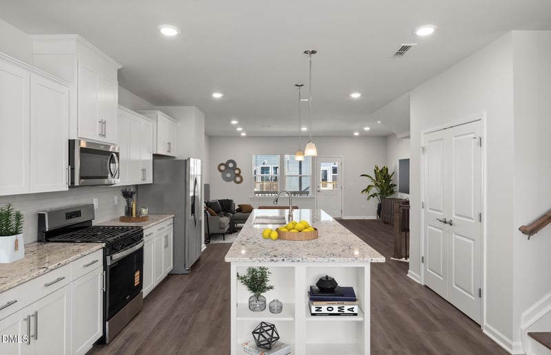 Listing details for 918 Fearless Rd, Durham, NC 27703 : ''Welcome to Everton, a new townhome community just minutes from Brier Creek's best shopping, dining, and recreation. This stylish end-unit tri-level townhome offers 3 bedrooms, 3.5 baths, and a rear-load 2-car garage, blending functionality, comfort, and convenience. Step into an open-concept kitchen featuring stone gray cabinetry, Luna Pearl granite countertops, and Driftwood 7'''' plank EVP flooring—perfect for entertaining. The adjacent private deck creates an inviting space for dinner parties or relaxing outdoors. The Owner's Suite impresses with a tray ceiling, recessed lighting, and a spa-inspired bath complete with quartz countertops, dual vanity, and a tiled walk-in shower with bench. Guests will appreciate the first-floor suite with its own bath and walk-in shower, offering privacy and comfort. Enjoy our Energy Advantage program efficiency for lower utility costs and peace of mind, plus Spectrum internet and cable is included with the HOA dues, keeping you connected without extra hassle. Stylish, spacious, and close to everything—this is the lifestyle you've been waiting for!''