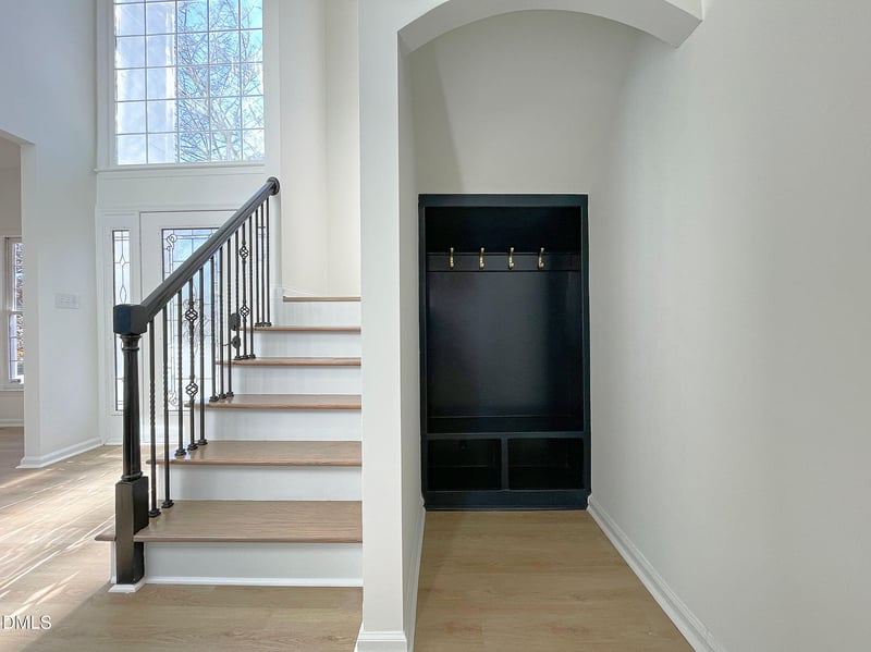 Listing details for 9332 Leslieshire Dr, Raleigh, NC 27615 : Beautifully updated transitional home in prestigious Windsor Forest with bright open floor plan and flat fenced backyard! Updates include, New LVP flooring and carpet, interior and exterior paint, countertops, designer lighting and plumbing fixtures and more! Soaring 2 story foyer with board & batten feature wall and built-in cubbies. Living room/Office with designer accent wall, crown molding and LVP. Dining room with LVP flooring, crown molding and bay alcove. Spacious Family room with gas log fireplace , LVP flooring, ceiling fan and new wood mantle opens to sunny Kitchen with crisp white cabinets, quartz counters, custom range hood, stainless appliances including French door refrigerator and tile backsplash. Kitchen also includes amazing walk-in pantry with wine rack, shelving and cabinets as well as a light filled breakfast nook. Primary bedroom with vaulted ceiling, LVP flooring, ceiling fan and spacious walk-in closet with built-ins. Stunning spa style Primary bathroom with furniture vanity with 2 sinks and marble countertop, tile floor and huge tile shower with frameless glass enclosure and 3 shower heads including rain shower, shampoo niches and bench. Generous sized secondary bedrooms. Updated Hall bath with quartz vanity and tile tub/shower. Bonus room could be 4th bedroom. Entertain or just relax on the large deck with raised grilling deck!! Walk to the neighborhood access to Durant Trails Nature Preserve!! Close to shopping, dining, I-540 and Falls Lake!!