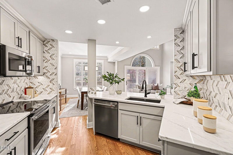 Listing details for 95113 Vance Knolls, Chapel Hill, NC 27517 : Beautifully updated 2-bedroom villa in the prestigious Governors Club neighborhood, offering refined finishes and serene golf course views. The designer kitchen showcases a statement chevron tile backsplash and premium GE Café line refrigerator, microwave, and dishwasher, seamlessly blending style and function. The living room is both grand and inviting, highlighted by soaring 20-foot ceilings, a gas fireplace and expansive windows that drench the home in natural light. Enjoy rich hardwood floors throughout the home that offer timeless style and warmth. Each bedroom offers a private retreat, featuring ensuite baths with floor-to-ceiling tiled showers, stone countertops, and elegantly updated fixtures. Outdoors, a private deck overlooks the 17th fairway, providing a tranquil backdrop for relaxation and entertaining. A rare opportunity to enjoy elevated villa living in a gated community with picturesque views.
