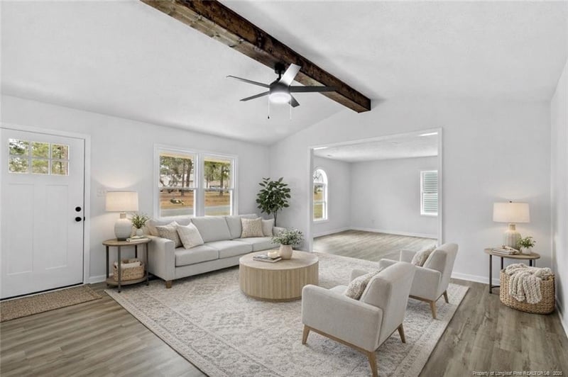 Listing details for 9577 Mountain Home Dr, Fayetteville, NC 28314 : Welcome to this beautifully updated home featuring 3 bedrooms plus a den,2 bathrooms, and a modern floor plan designed for both everyday living and entertaining. The spacious living room immediately impresses with soaring vaulted ceilings, a stunning wood beam accent, and a custom fireplace framed by elegant fluted walls — creating a true statement space.New luxury vinyl plank flooring flows throughout the home, leading you into a breathtaking kitchen that has been completely upgraded. Enjoy brand-new cabinetry, recessed lighting, real marble countertops, and new stainless steel appliances. A large storage area adds both convenience and functionality.Two generously sized guest bedrooms share an updated full bath, offering comfort and style for family or visitors. The primary suite is a true retreat with a spacious layout, large closet, and a luxury en suite bath featuring updated vanities, modern lighting and fixtures, plus a custom two-tone tile shower with an LED light strip for a spa-like experience.Step outside and enjoy the fully fenced backyard complete with a large new concrete patio — perfect for entertaining — two storage sheds, and a peaceful tree-lined backdrop for added privacy.Featuring all NEW in 2026, NEW LVP flooring, NEW hot water heater, NEW windows, NEW concrete patio, upgraded baths with custom tile shower, NEW vapor barrier, and custom lighting, and septic recently pumped (3/10/2026). This home blends modern upgrades, thoughtful design, and outdoor living all in one!