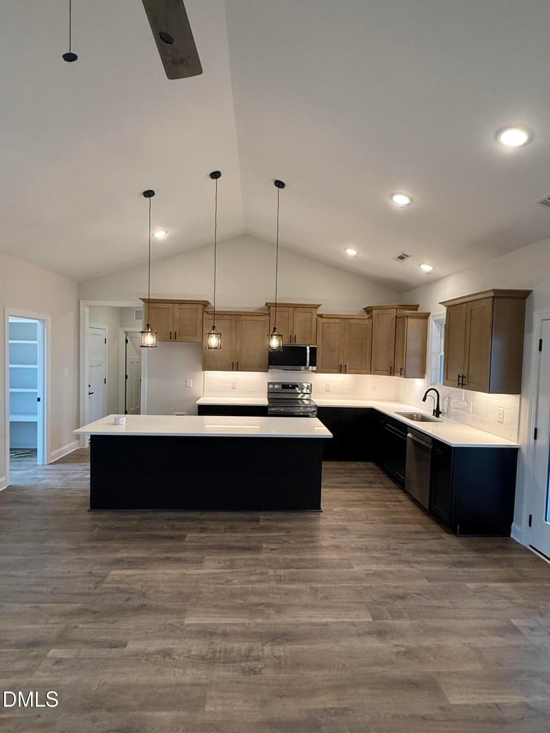 The vaulted living room creates an open, airy feel and is anchored by a Smart WiFi-enabled electric fireplace. Crown molding accents the kitchen, dining area, and main bedroom, while designer-selected lighting and LED dimmable fixtures elevate every space.