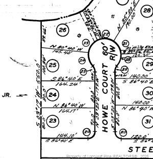 Listing details for Lots 23-26 Howe Ct, Fayetteville, NC 28306 : Four residential lots located in COPELAND ACRES. Lot 23 is 0.34 acres, Lot 24 is 0.29 acres, Lot 25 is 0.34 acres, Lot 26 is 0.36. There is a purposed street/cul-de-sac (as seen on plat map) called Howe Ct with a 60ft right-of-way. Confirmation from DOT that Howe Ct. is not a state maintained road, so lot owner(s) will need to contact DOT and/or mapping and planning to find out who is to complete this road. Lot 26 has a 20ft drainage easement as well as a 5ft utility easement on the rear lot lines. There is an electric hook-up with PWC.